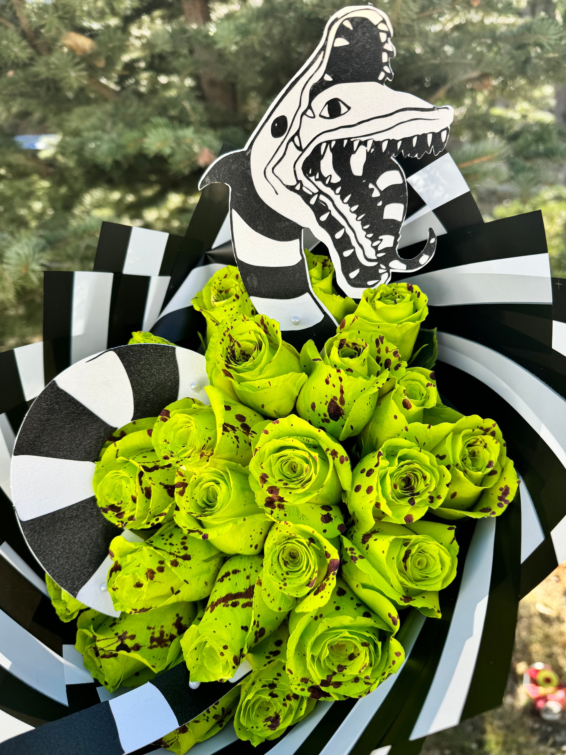 Bouquet includes custom lime green roses with purple splatter and beetle juice worm topper.