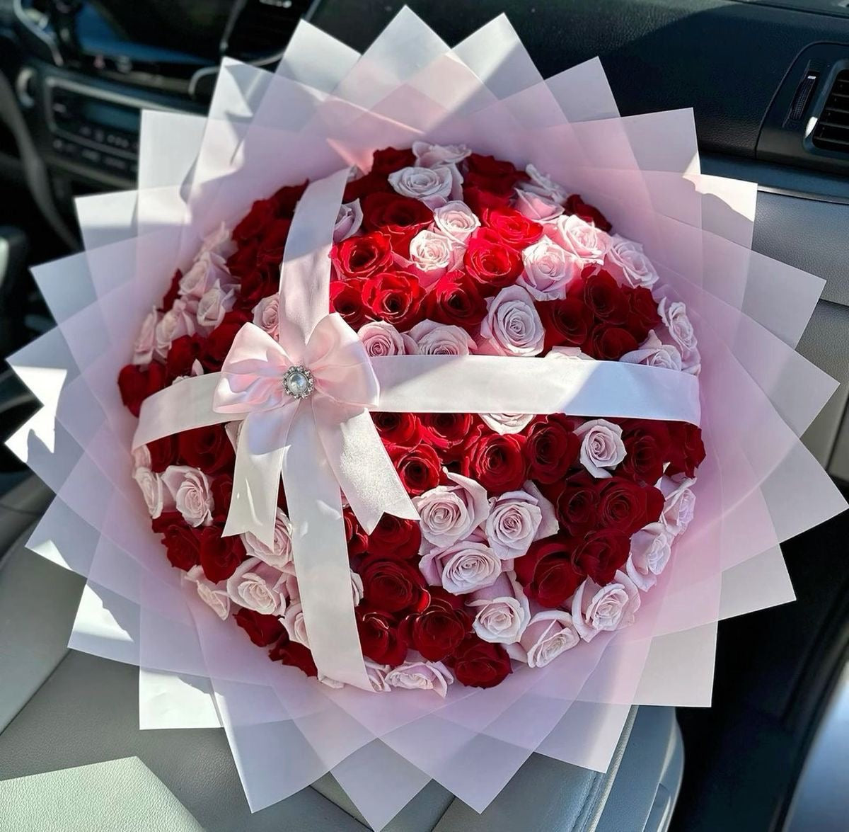 Bouquet will include a total of 50 roses, half red, half light pink. Will also include ribbon details and wrapping.