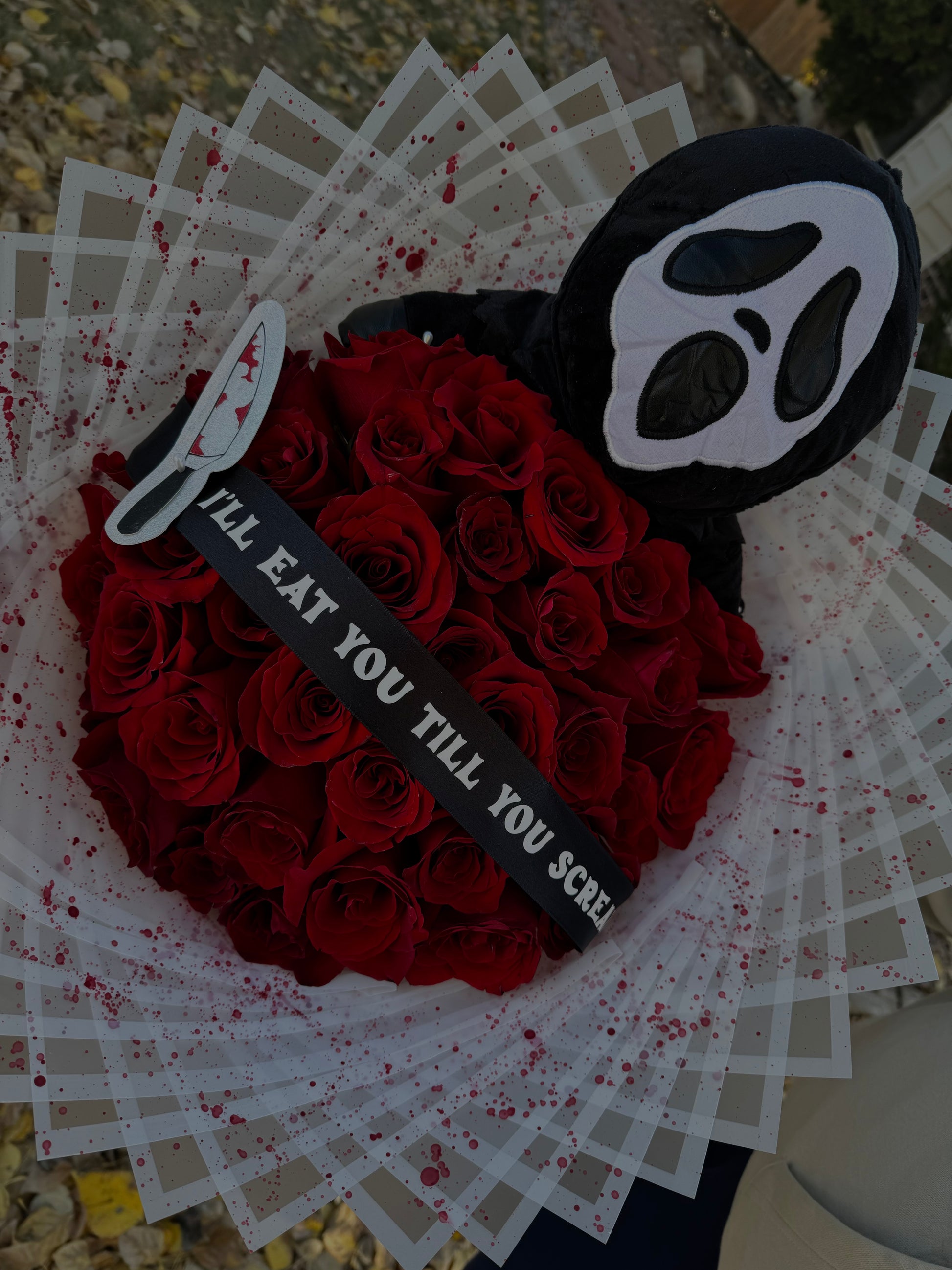 Bouquet will include red roses, Ghostface Plushy, blood splatter and “I’ll eat you till you scream” banner. 🩸🔪